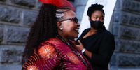 "name": " President Cyril Ramaphosa and First Lady Tshepo Motsepe with National Assembly Speaker Nosiviwe Mapisa-Nqakula and National Council of Provinces (NCOP) chairperson Amos Mason do outside City Hall in Cape Town, South Africa on Thursday 10 February 2022 prior to the State of the Nation Address. (Photo: Leila Dougan)",
